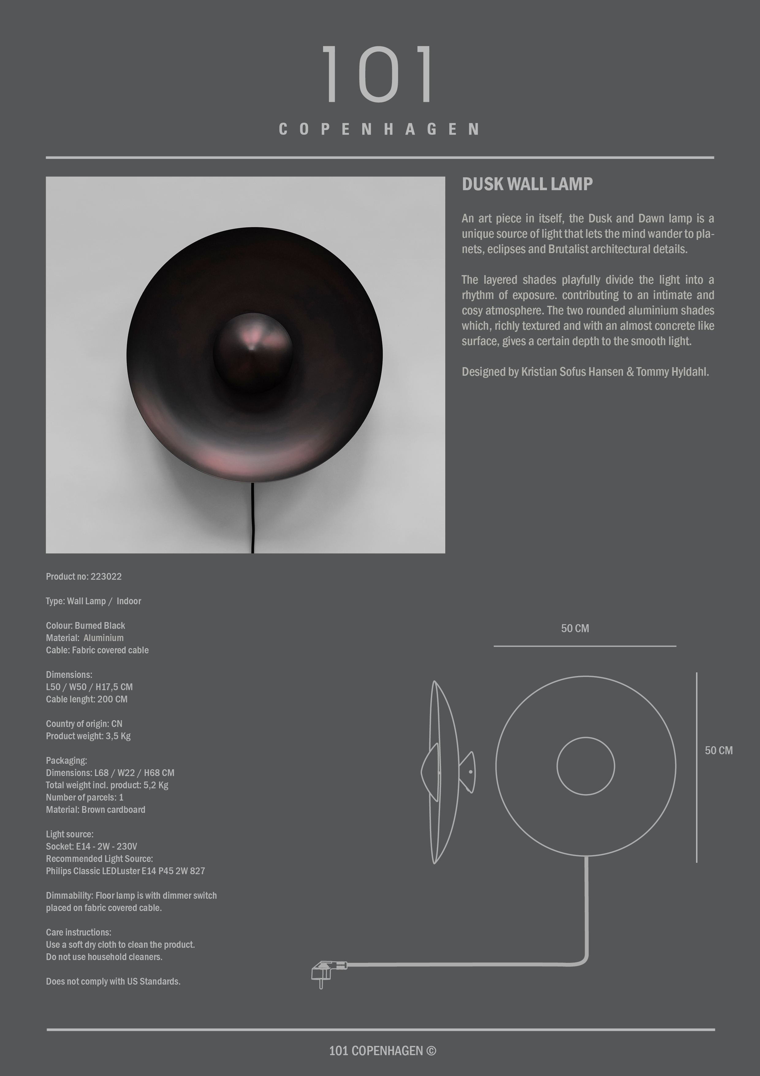 Dusk seinävalaisin 101 Copenhagen-tuotemerkiltä uniikilla muotoilulla alumiinista pyöreällä muodolla ja brutaaleilla, arkkitehtonisilla yksityiskohdilla. Rakenteinen pinta miellyttävällä, leikkisällä valolla. Täydellinen yksityiskohta mihin tahansa huoneeseen.