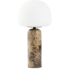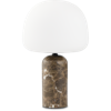 Northernin Kin-pöytävalaisin on pieni muotoilun jalokivi, joka pistää heti silmään. Sen pyöreä, pehmeä siluetti ja suuri opaalinvalkoinen lasivarjostin, joka tasapainoilee tyylikkäällä marmorijalustalla, saavat sen tuntumaan melkein kuin modernilta bobblehead-hahmolta lampun muodossa. Silkkisen lasin ja kiillotetun Emperador-marmorin välinen kontrasti luo ilmeen, joka on sekä leikkisä että hienostunut.