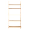 Library hylla 114,8 merkiltä FRAMA. Hylly on jatkoa Framan tunnetulle hyllymuotoilulle. Tammikiskoihin tukevilla teräsruuveilla kiinnitetyt hyllyt voidaan helposti sijoittaa ja muuttaa eri tavoin kotisi sisustuksen mukaan. Mukana on viisi hyllylevyä, ja h