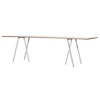 Loop Stand pöytä Hay-tuotemerkiltä tyylikkäällä, modernilla muotoilulla. Siinä on 3-jalkaiset pukkituet jauhemaalatusta metallista teollisella, tunnusomaisella lookilla ja sekä kotiin että toimistoon täydellisesti sopiva minimalistinen pöytälevy erilaisilla, eleganteilla, vaihtoehtoisilla materiaaleilla.