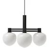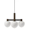 LYFA-merkin MEMOIR 120 III -kattokruunu modernilla muotoilulla inspiraatiolla klassikkokyntteliköstä. Siinä on kolme kevyesti muotoilevaa lampunvarjostinta opaalilasista suoraviivaisella rakenteella metallista koristeellisilla yksityiskohdilla.