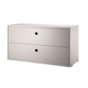 String-lipasto kahdella käytännöllisellä laatikolla pyöreillä, leikatuilla kahvoilla. Osa hyllyjärjestelmästä vakaalla rakenteella, loputtomilla mahdollisuuksilla klassisella, ikonisella muotoilulla ikuista takuutyylikkyyttä varten ja klassisella, ikonisella muotoilulla ikuista takuutyylikkyyttä varten. Huippulaatu korkealaatuisilla materiaaleilla kestämään useiden sukupolvien käytön.