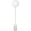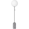 Globen Lighting -merkin Torrano-lattiavalaisin modernilla muotoilulla kauniilla valaisimen jalalla kivestä, pyöreällä, valkoisella lampunvarjostimella lasista ja yksityiskohdilla metallista.